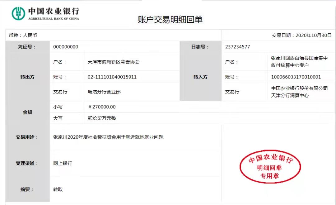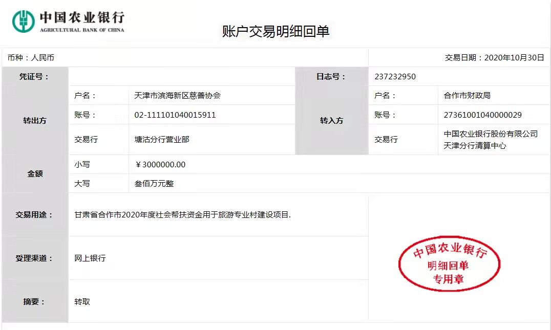 截至2020年12月31日,滨海新区慈善协会共接受用于东西部扶贫捐款32886764.08元,拨付资金32891261.32元(含利息),圆满完成区委专项办部署的工作任务。